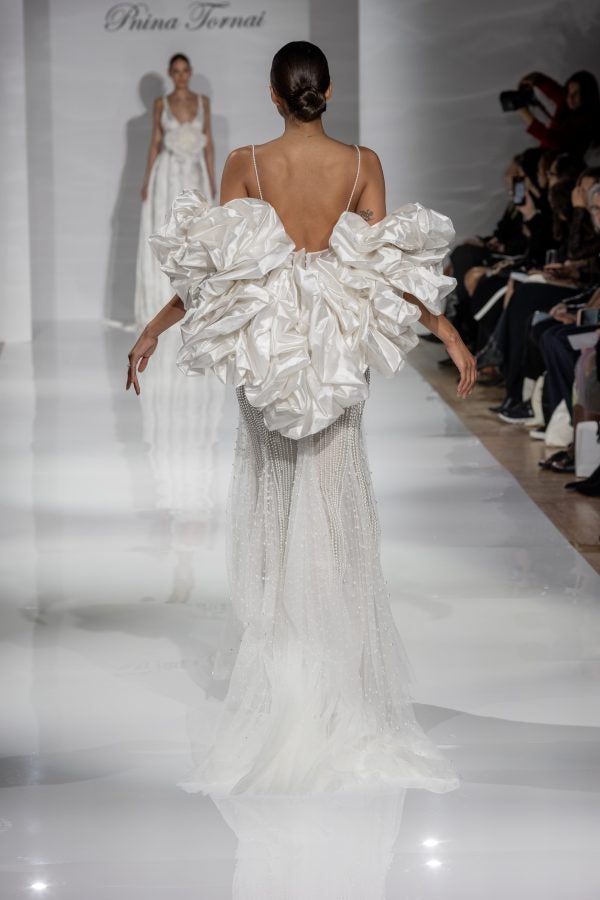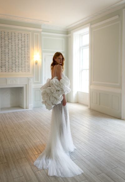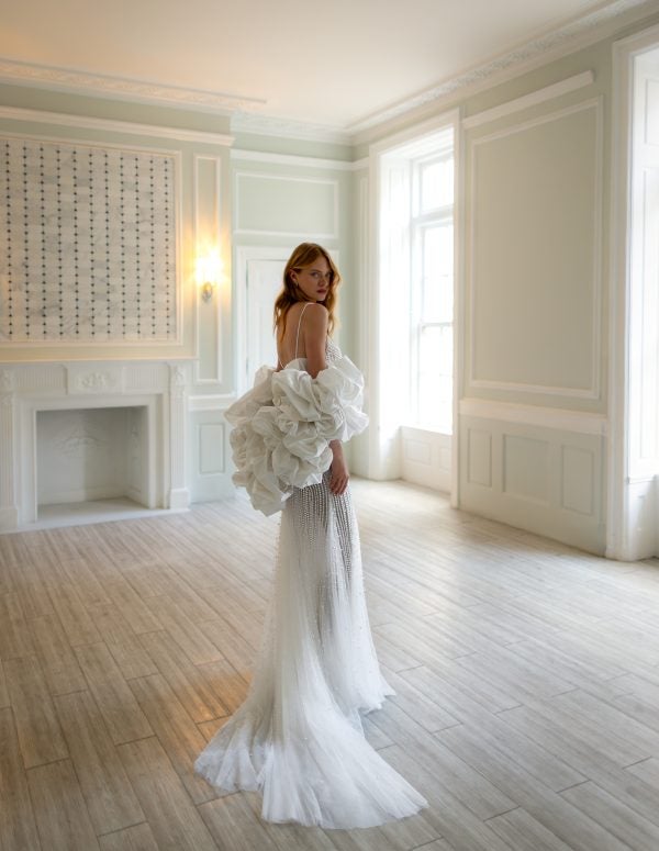 This elegant fit-and-flare gown is lavishly embellished with hand-beaded pearls from head to toe. Delicate spaghetti straps frame the décolletage before melting into a scoop neckline and waist-defining, corset bodice. Intentionally crafted to elongate the body, the geometric design cascades into a stunningly-scattered pearl, godet, tulle skirt. Instantly elevate this contemporary bridal look with the designer’s handmade, silk taffeta, floral shawl.