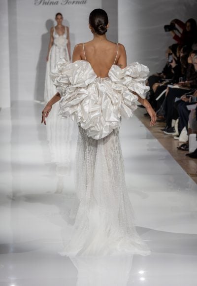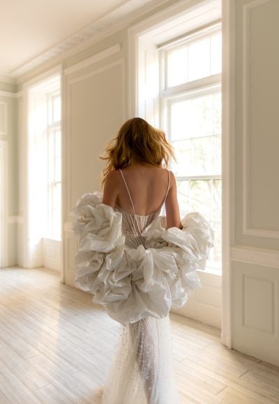 This elegant fit-and-flare gown is lavishly embellished with hand-beaded pearls from head to toe. Delicate spaghetti straps frame the décolletage before melting into a scoop neckline and waist-defining, corset bodice. Intentionally crafted to elongate the body, the geometric design cascades into a stunningly-scattered pearl, godet, tulle skirt. Instantly elevate this contemporary bridal look with the [...]