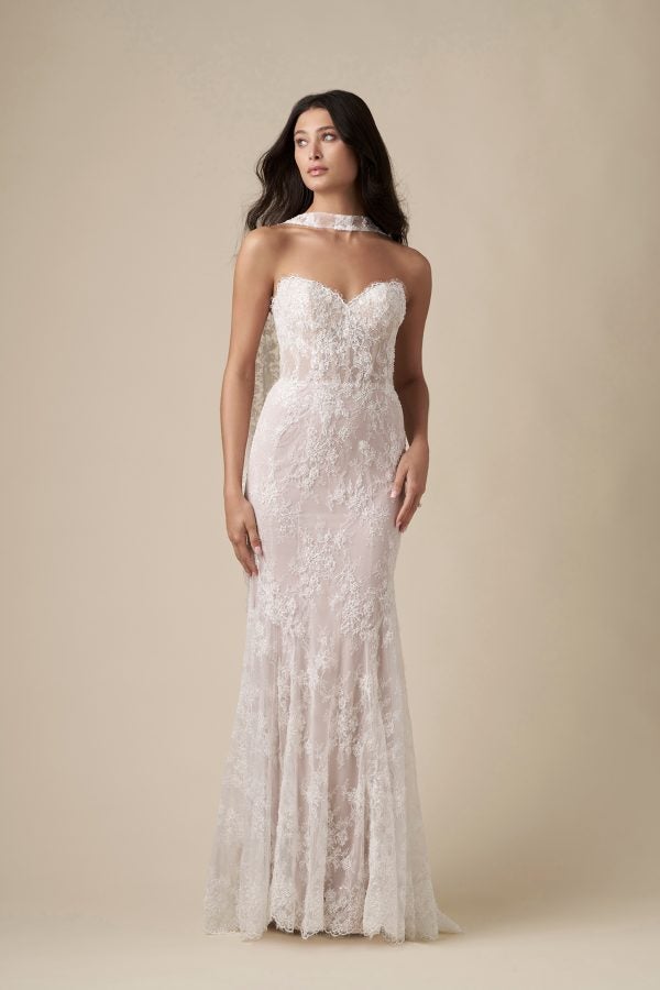 This chic and glamorous sheath gown features a strapless cut and sweetheart neckline complete with a delicate lash trim. Expertly crafted with exquisite Chantilly lace, intricate beading cascades and shimmers throughout the figure-hugging silhouette. The structured corset bodice sculpts the upper body before meeting the natural waistline. Instantly elevate this feminine bridal look with the gown’s dramatic lace neck scarf.