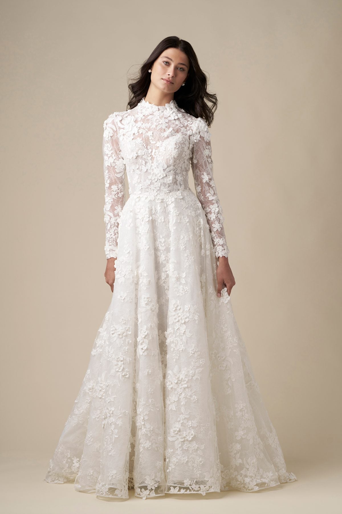 Chic and romantic, this A-line gown features a sheer high neckline and delicate long sleeves. The sweetheart cut meets a structured corset bodice and natural waistline that sculpts the upper body. Expertly crafted with a layer of Chantilly lace, dimensional floral appliqués densely cascade throughout the soft silhouette. The high backline is paired with an endless row of fabric-covered buttons that flows into the dramatic train.