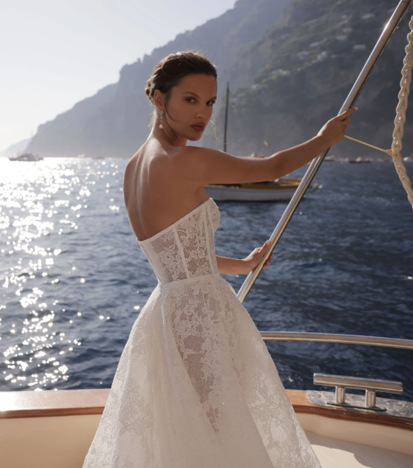Chic and romantic, this shimmering ball gown is expertly designed with exquisite Chantilly lace from head to toe. The strapless cut is paired with a sleek, straight neckline while a corset bodice with exposed boning perfectly sculpts the upper body. A lightweight yet grand full skirt falls from the natural waistline and cascades into a breathtaking train.