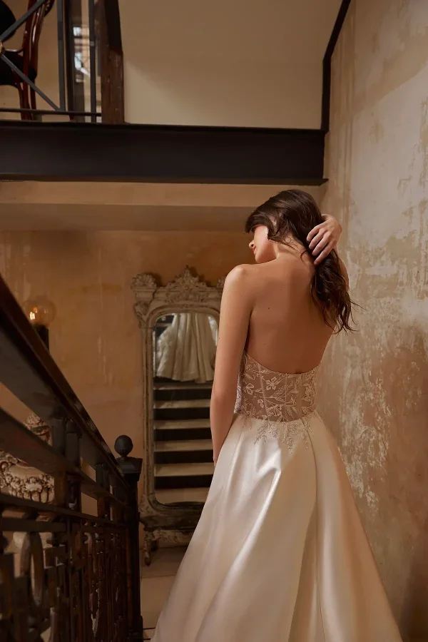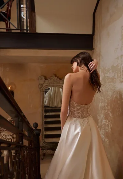 The Sancerre gown is a chic and modern A-line gown crafted with impeccable hand-draping and architectural details. A captivating sweetheart neckline meets intricate and dainty beading adorning the exposed corset bodice. The delicate asymmetry offers movement and fluidity intro its effortless full mikado skirt. The leg-bearing slit provides a playful yet tastefully sexy element that [...]