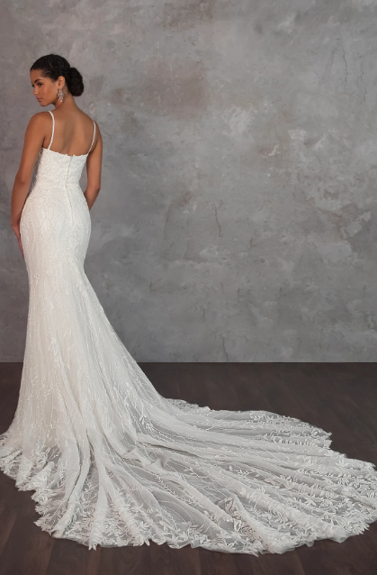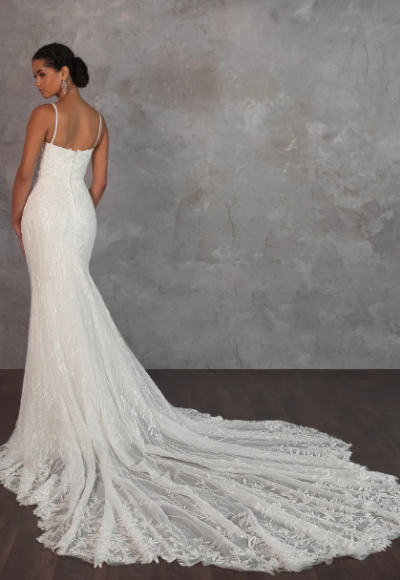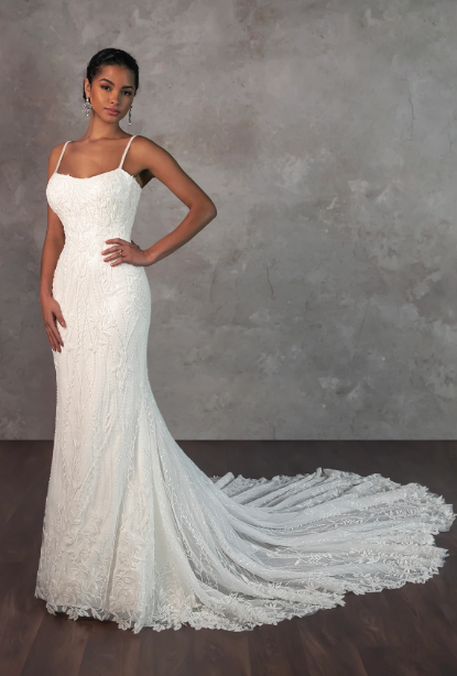 This botanical-inspired sheath wedding dress is expertly designed with embellished leaf and vine-inspired appliqués that shimmer and cascade throughout the figure-hugging silhouette. Thin straps melt into a scoop neckline that elegantly frame the décolletage while the structured bodice sculpts the upper body. A sleek square backline flows into a sheer, scalloped train that completes this romantic and glamorous bridal look.