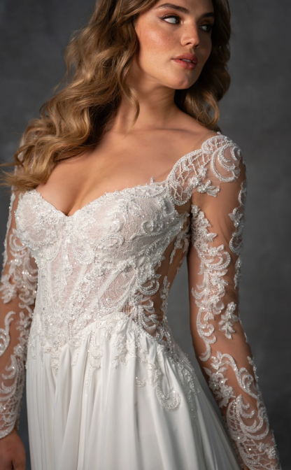 Exuding romance and glamour, this A-line gown features a sweetheart neckline and illusion long sleeves that are intricately adorned with beaded lace appliqués. The embellished corset bodice showcases exposed boning before falling to a basque waistline that sculpts the upper body. Expertly crafted with Silk Chiffon fabric, the simple skirt, complete with a slit, cascades into a lightweight train. A low illusion back, adorned with a row of crystal buttons, completes this ethereal bridal look.