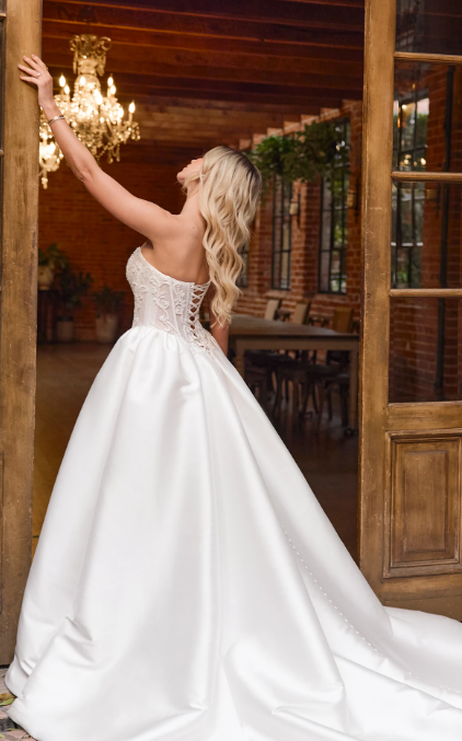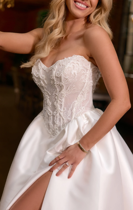 Regal and romantic, this ball gown features a strapless cut paired with a sweetheart neckline that elegantly frames the décolletage. Expertly designed with pearl-adorned lace appliqués, the corset bodice sculpts the upper body while showcasing exposed boning. Crafted with Silk Mikado fabric, a full, pleated skirt with a slit cascades from the basque waistline. To finish, a lace-up back ensures an impeccable fit while a row of fabric-covered buttons flows to the end of the cathedral-length train.