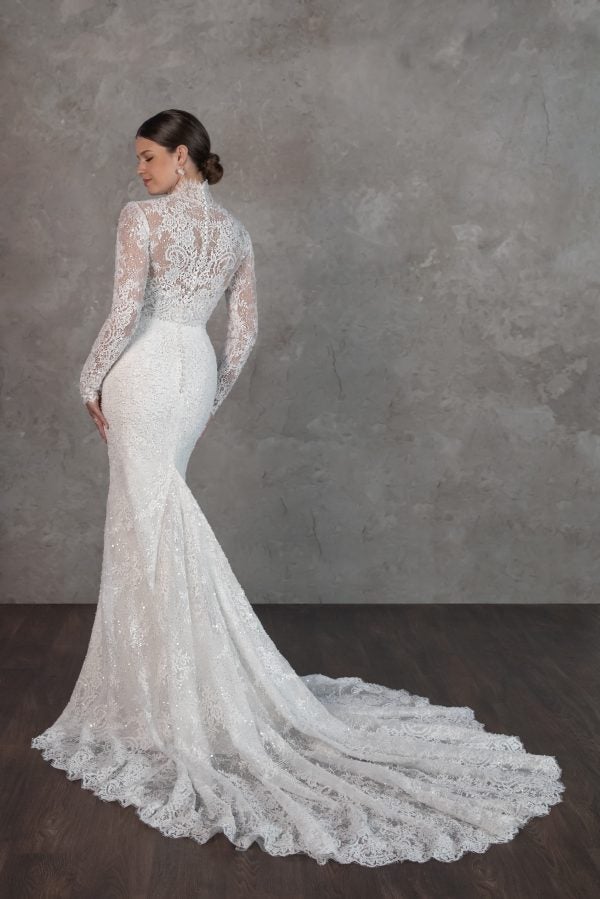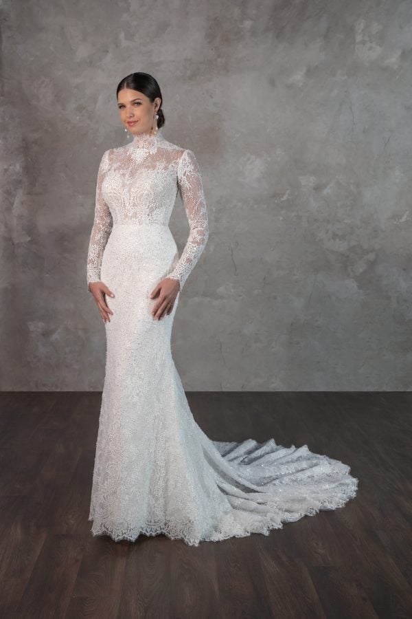 Chic and feminine, this sheath gown features a high, mock neckline paired with a sweetheart cut and sheer long sleeves. Expertly designed with beaded Chantilly lace, the sheer, corset bodice sculpts the upper body before meeting a natural waistline. A delicate lash trim completes the hem before cascading into an exquisite train. To finish, a row of fabric-covered buttons adorns the high backline.