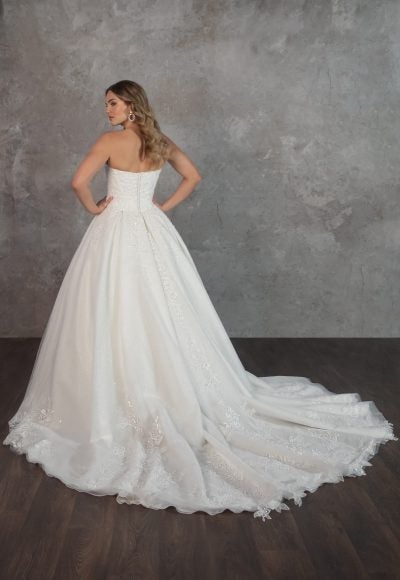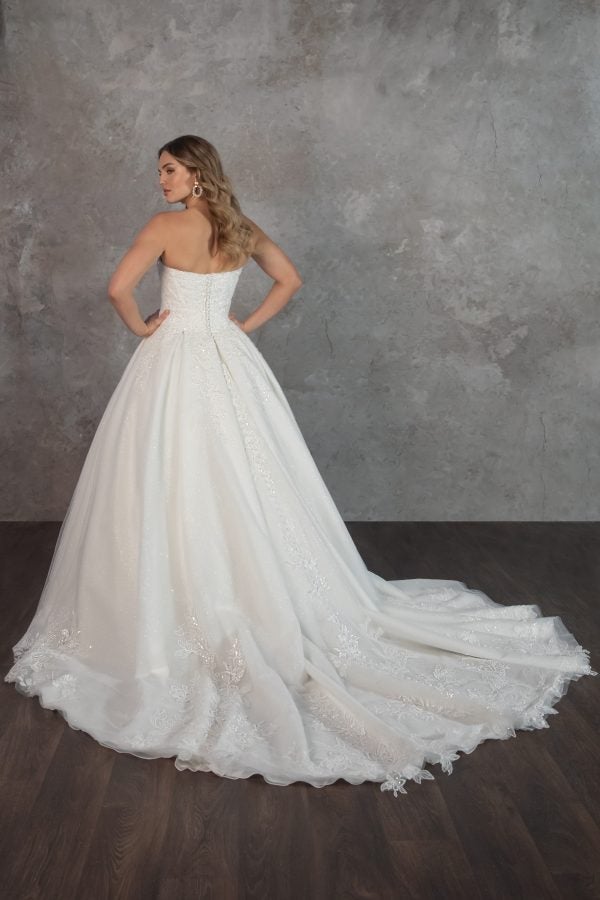 Exuding glamour and classic elegance, this ball gown features a strapless cut and embellished sweetheart neckline that frames the décolletage. Expertly crafted with shimmer tulle, beaded lace appliqués adorn the structured bodice and cascade throughout the tulle skirt. The dropped waistline elongates the body while pleating adds drama to the regal bridal look. To finish, an endless row of buttons flows into the cathedral-length train.
