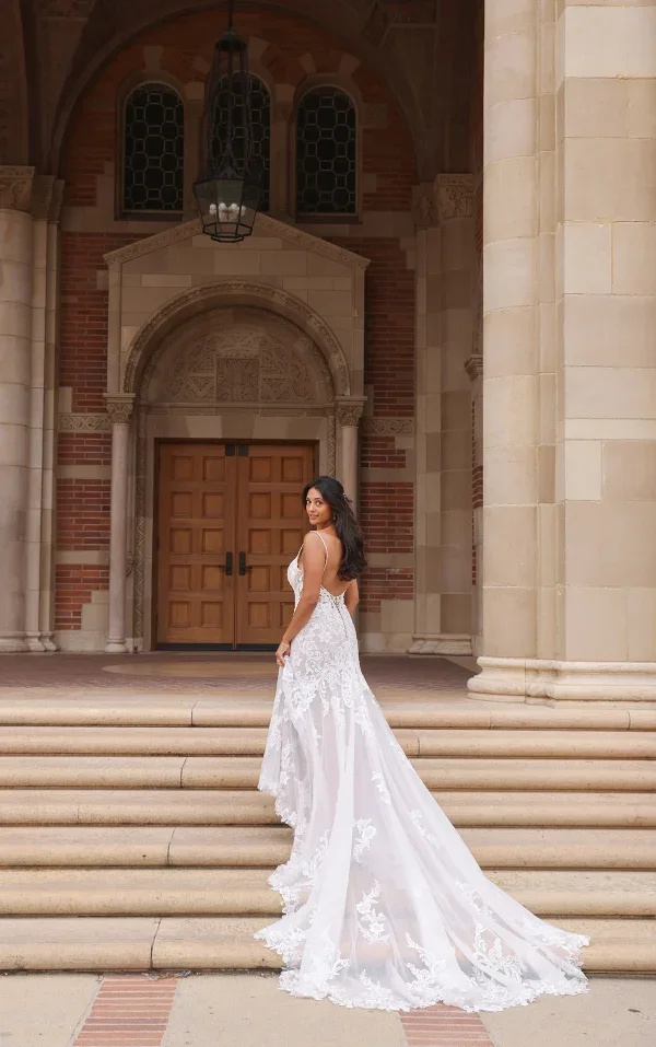 Beaded spaghetti straps cascade into a plunging V-neckline on this stunning figure-hugging gown. Effortlessly sexy, romantic, and elegant, lace is intentionally placed throughout the bodice and skirt to accentuate and lengthen the body. Best of all, a low scoop back meets fabric-covered bridal buttons before melting into a flared tulle skirt and show-stopping train.
