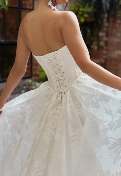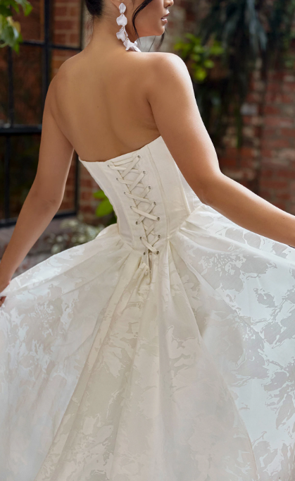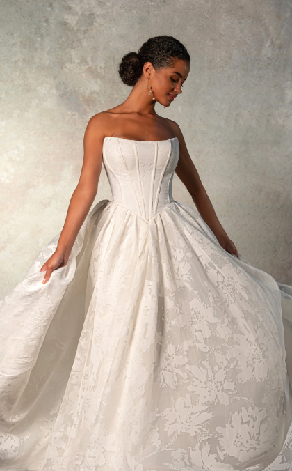 Soft and romantic, this strapless ball gown is expertly crafted with floral-embossed organza fabric. The contemporary cat-eye neckline frames the décolletage before meeting a corset bodice with exposed boning. The basque waistline sculpts the upper body before flowing into a full, pleated skirt complete with a long train. To finish, a lace-up back ensures an impeccable fit.