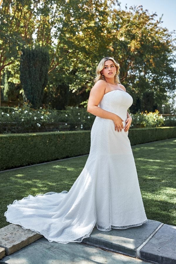 Dazzling in a shower of pearls adorning its sleek silhouette from neckline to hem, Style D4182 epitomizes modern sexy glamour in a romantic strapless fit-and-flare wedding dress made for the fashion-forward bride. A straight-across strapless neckline introduces a fitted lined bodice, seamlessly melting into a figure-hugging skirt. Just above the knee, the gown gracefully flares into an elegant trumpet skirt, creating a stunning bridal silhouette. The heavily-embellished pearl tulle adds a touch of sparkle and romance for a unique pearl wedding dress that shimmers down the aisle.