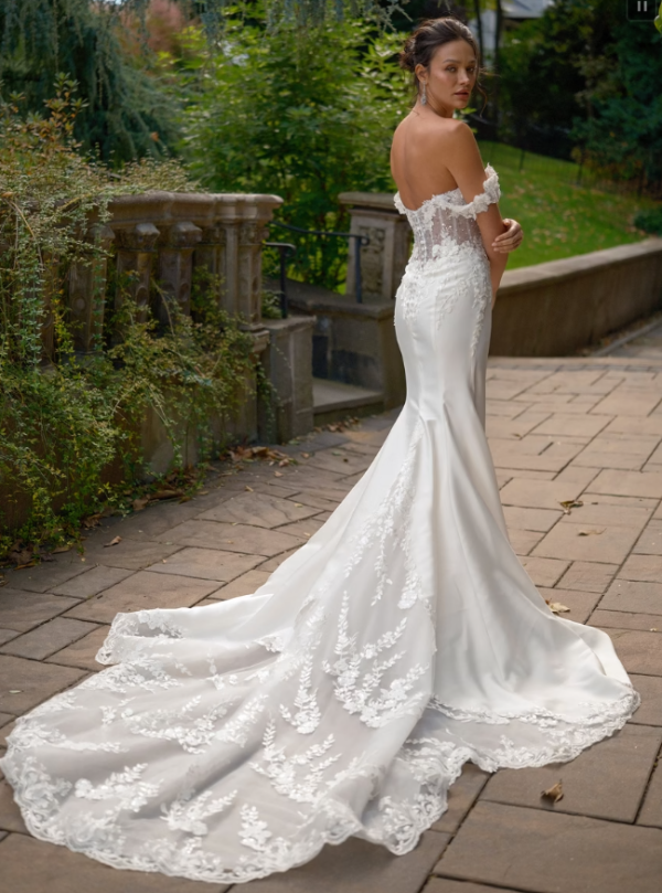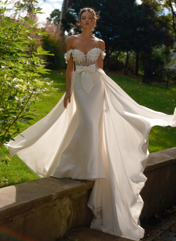 Romantic and glamorous, this fit-and-flare gown features a plunging sweetheart neckline that cascades into off-the-shoulder straps. The sheer corset bodice showcases exposed boning and is fully adorned with meticulously-beaded appliqués. The basque waistline meets a sleek, figure-hugging skirt expertly crafted with Silk Mikado fabric before flowing into a scalloped lace train. Instantly elevate this feminine bridal look with the gown’s detachable bow-adorned overskirt.