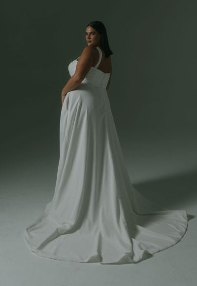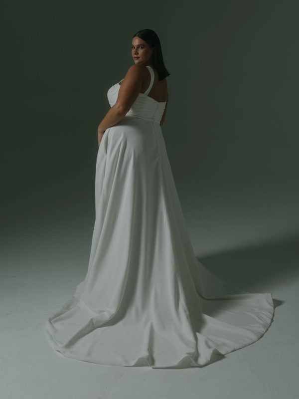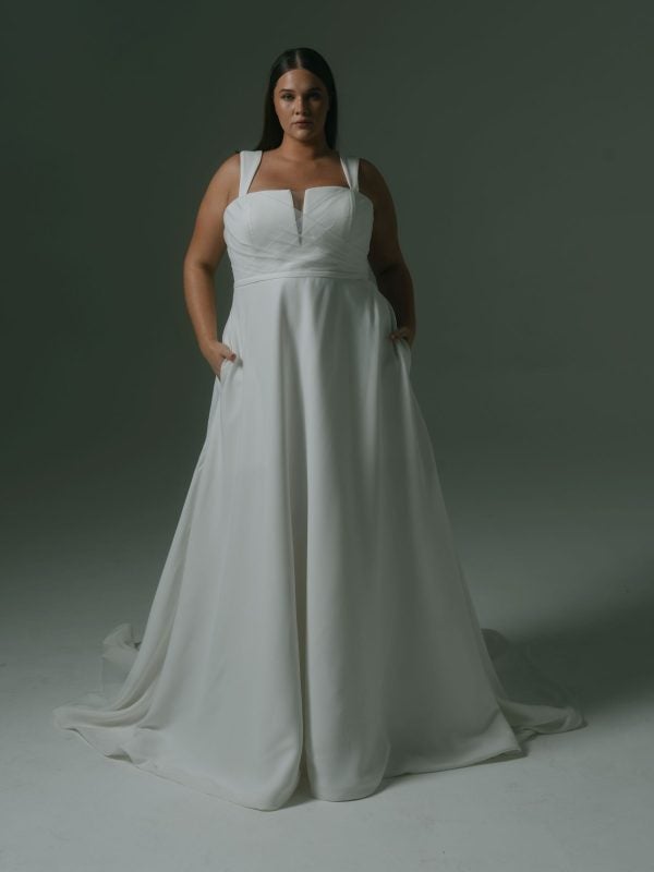 Equally romantic and classic, this soft A-line gown features tapered straps that can also be worn off the shoulder. Expertly crafted with French crepe fabric, the striking, deep V-neckline frames the décolletage before melting into structured bodice adorned with fine tulle pleating. A row of pearl buttons adorns the back of the structured bodice. To finish, an effortless skirt, complete with pockets, flows into an aisle-worthy skirt.