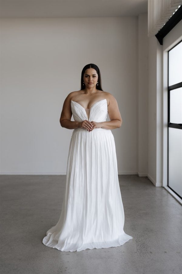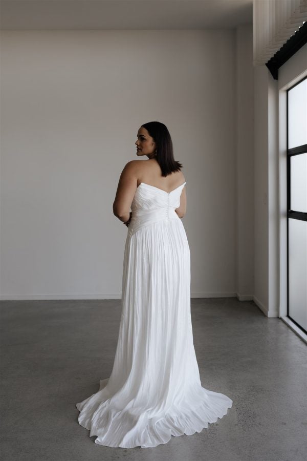 Expertly crafted with pleated silky satin, this effortless A-line gown features a strapless cut and plunging sweetheart neckline that frames the décolletage. Intentionally-draped ruching adorns the structured bodice before seamlessly cascading into a soft skirt. A row of pearl buttons completes this elegant and chic bridal look.