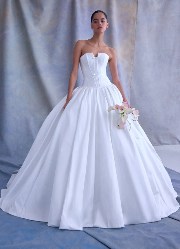 Chic and timeless, this breathtaking ball gown is expertly designed with Silk Mikado fabric. The strapless cut is paired with a contemporary notch neckline that elegantly frames the décolletage before melting into a structured corset bodice. Exposed boning is paired with two delicate bows while the dropped waistline meets a full, pleated skirt. To finish, a statement-making train completes this tailored bridal look.