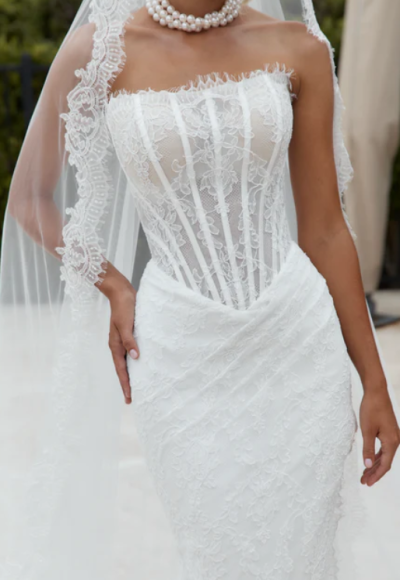 Chic and romantic, this fit-and-flare gown is expertly designed with exquisite Chantilly lace from head to toe. The strapless cut is paired with a straight neckline complete with a delicate lash trim that frames the décolletage. The sheer corset bodice sculpts the upper body before falling to a basque waistline and figure-hugging skirt with soft draping. Instantly elevate this feminine bridal look with the gown’s matching detachable overskirt and sleeves.