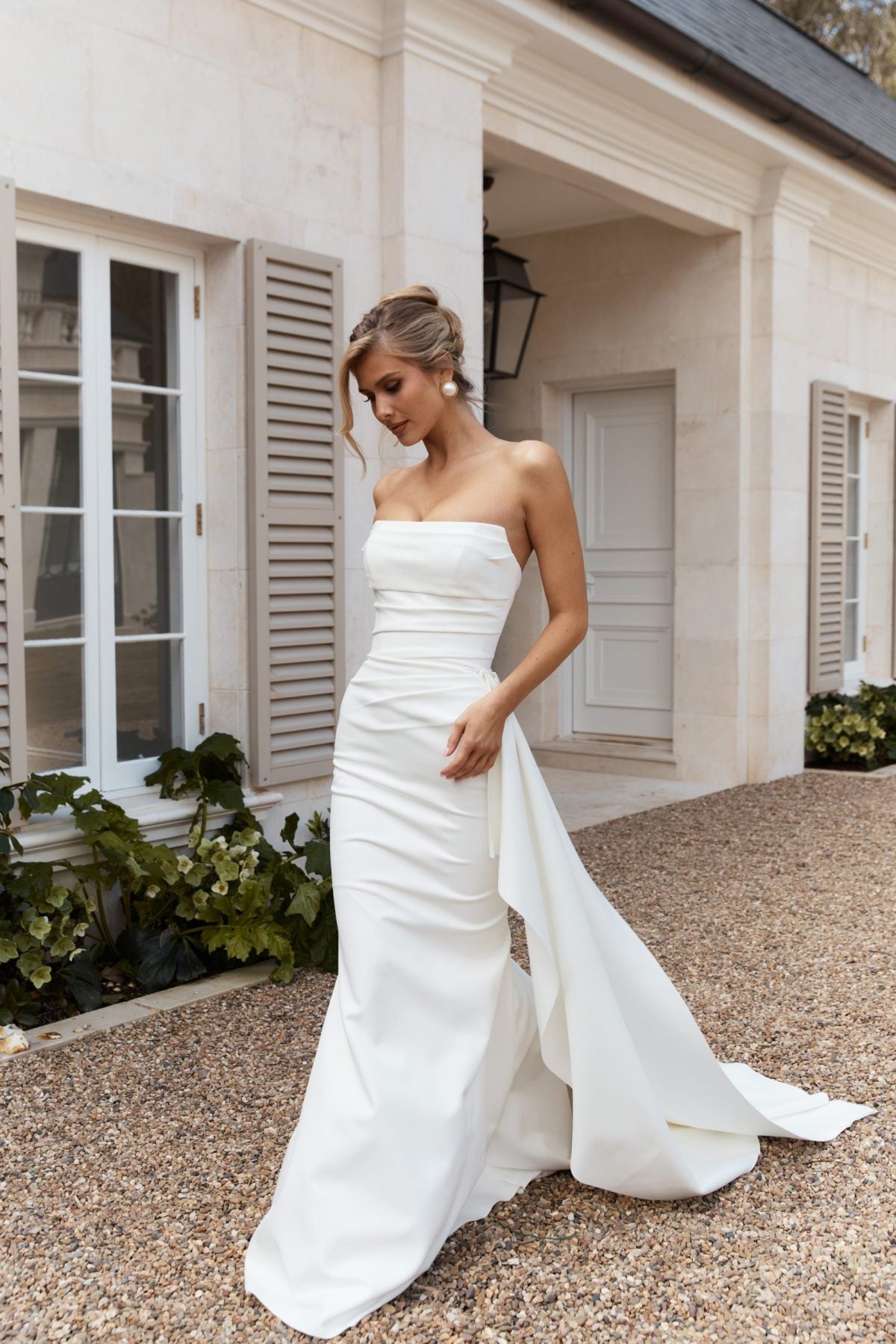 Elegant and modern, this minimalist fit-and flare gown features a strapless cut and sleek cat-eye neckline that frames the décolletage. Expertly crafted with Bonded Crepe fabric, delicate ruching adorns the structured corset bodice before meeting a natural waistline and seamlessly cascading into the figure-hugging silhouette. A detachable side train creates the versatility of two looks in one, offering an elevated a dramatic element to this chic bridal look.