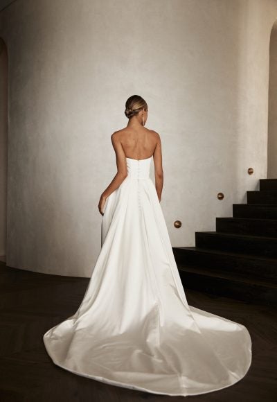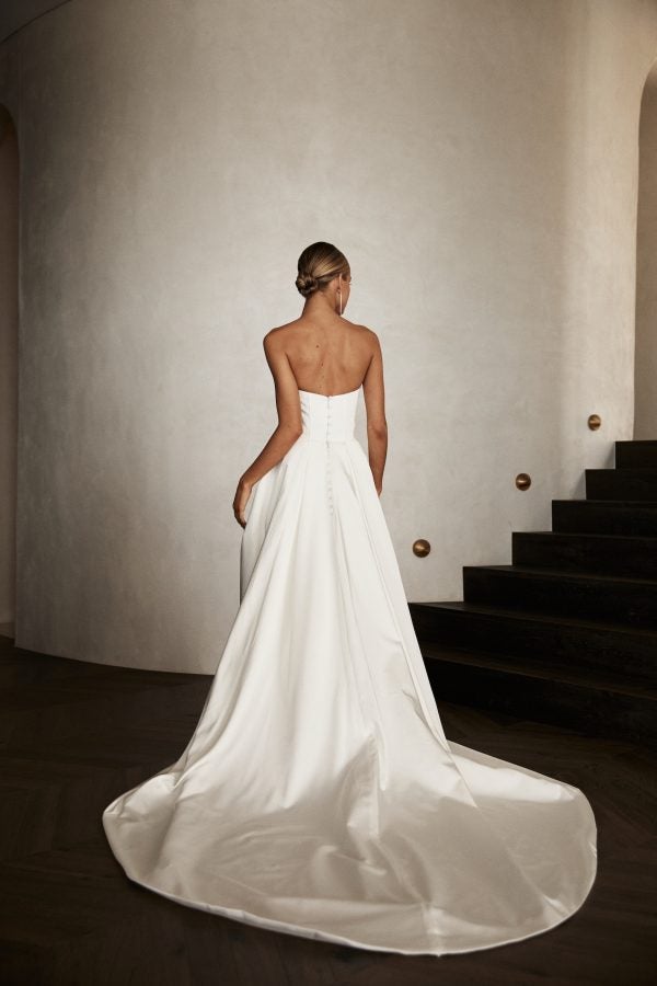 Statuesque and elegant, this minimalist figure-hugging gown features a strapless cut paired with a contemporary sweetheart neckline. Impeccable draping meets a waist-defining corset bodice with exposed boning before melting into additional draping and a sleek silhouette complete with a slit. To finish, an overskirt adorned with fabric-covered buttons adds an unforgettably dramatic element.