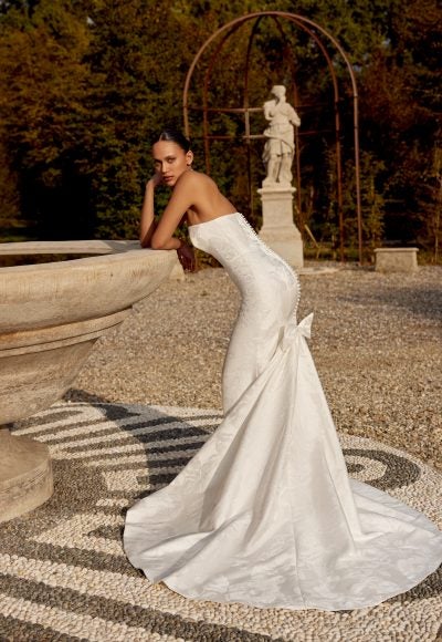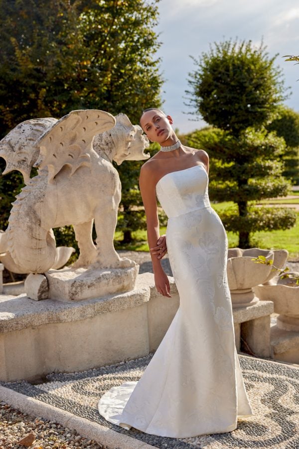 Chic and elegant, this fit-and-flare gown features a strapless cut paired with a simple, straight neckline. Expertly crafted with floral brocade fabric, princess seams adorn the structured bodice before meeting a natural waistline. To finish, a row of fabric-covered buttons extends to the end of the sweep train. Instantly elevate this timeless bridal look with the gown’s detachable train adorned with a bow.