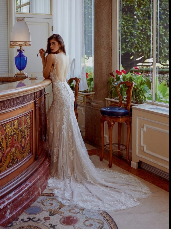This tastefully sexy figure-hugging gown features a plunging, illusion V-neckline and breathtakingly low, open back. A sheer, Chantilly lace underlay is paired with exquisite tonal beading and sequined lace appliqués that effortlessly cascade into the form-fitting skirt. A leg-bearing slit offers a chance to highlight an unforgettable pair of shoes while tulle-covered buttons complement the chapel-length train.