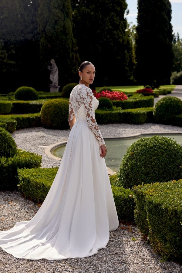 Effortlessly romantic and classic, this soft A-line gown is expertly crafted with Silk Charmeuse fabric and paired with corded Alençon lace long sleeves. The subtle sweetheart neckline showcases delicate draping before melting into a sleek and structured corset bodice. The natural waistline meets a simple skirt complete with a leg-bearing slit. To finish, a high backline is paired with a row of fabric-covered buttons that extends to the end of the chapel-length train.
