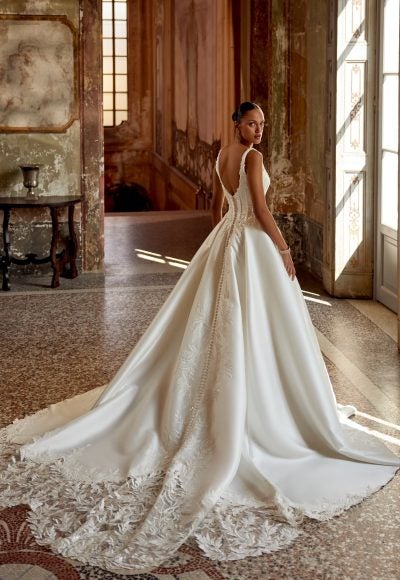Classic yet contemporary, this ball gown features a square neckline that melts into a corset bodice with exposed boning and a basque waistline. Expertly crafted with stretch Mikado fabric from head to toe, embellished floral embroidery scatters throughout the structured bodice and flows into a dramatic, cathedral-length train. The full, pleated skirt features pockets while the V-shaped backline meets a row of fabric-covered buttons.