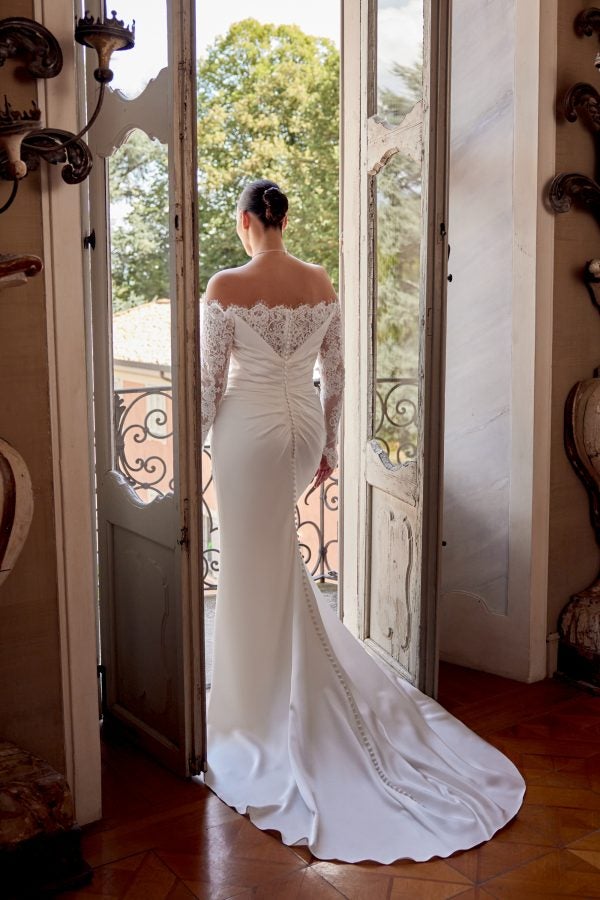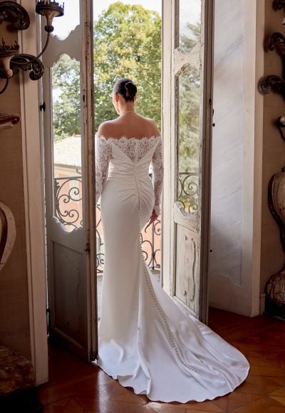 Chic and romantic, this figure-hugging gown features an off-the-shoulder neckline that elegantly frames the décolletage before cascading into corded Alençon lace long sleeves complete with buttons at the wrist. Expertly crafted with silk Charmeuse fabric, draping sculpts the body before melting into a sleek skirt with a slit. Delicate lace details adorn the V-shape back and meet a row of fabric-covered buttons that flow into the chapel-length train.
