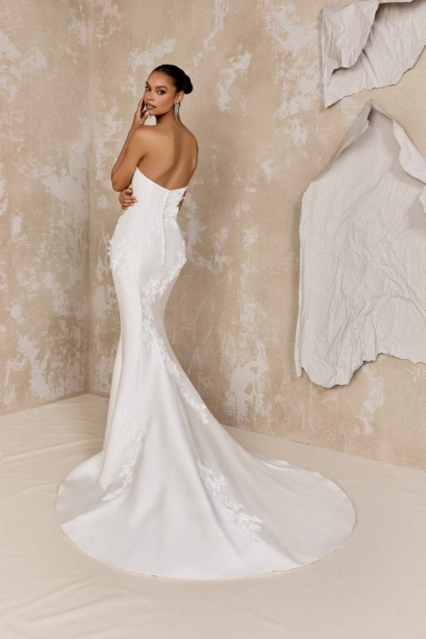 Elegant and romantic, this fit-and-flare gown features a strapless, cat-eye neckline. Perfectly crafted with luxe stretch Mikado fabric, the sleek bodice sculpts the upper body before flowing into a figure-hugging silhouette. Lace embroidery complements the simple fabric while three-dimensional, laser-cut, crepe floral appliqués adorned with clear beading and crystals add irresistible shimmer. To finish, a row of fabric-covered buttons extend to the end of the chapel-length train or add the gown’s matching detachable overskirt to instantly elevate this show-stopping look.