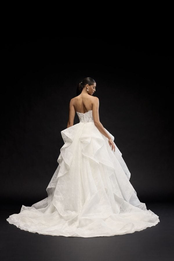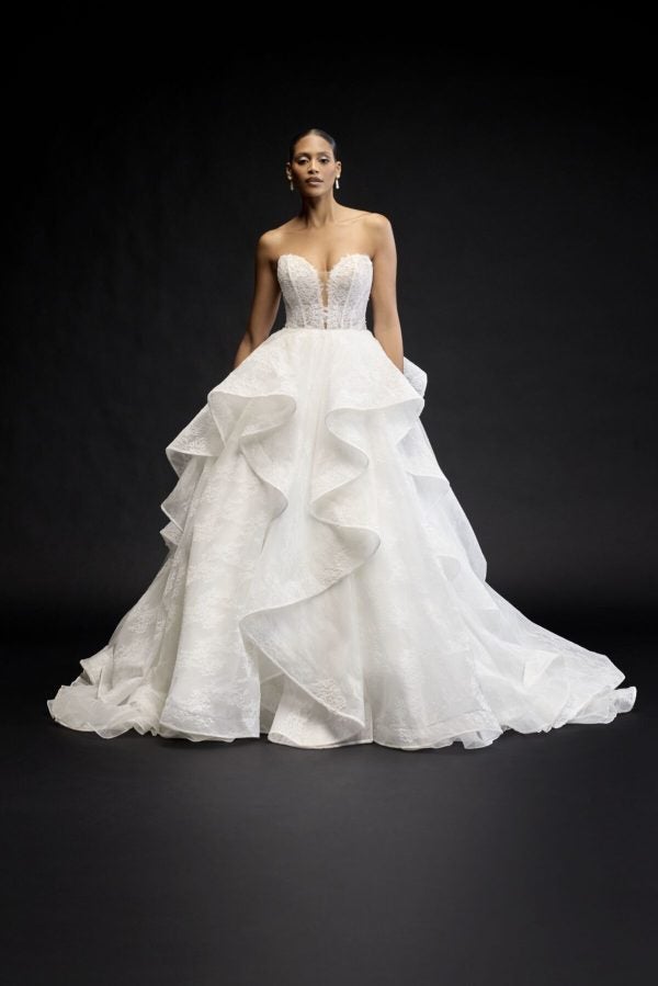This dreamy ball gown is expertly crafted with delicate Alençon lace from head to toe. The strapless cut is paired with a plunging sweetheart neckline that elegantly frames the décolletage. The sheer, corset bodice perfectly sculpts the upper body while showcasing exposed boning and an eyelash trim. Whimsical yet chic, the ensemble is complete with a full skirt that showcases waterfall-inspired tiers and a horsehair trim.