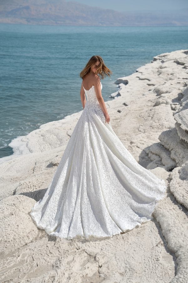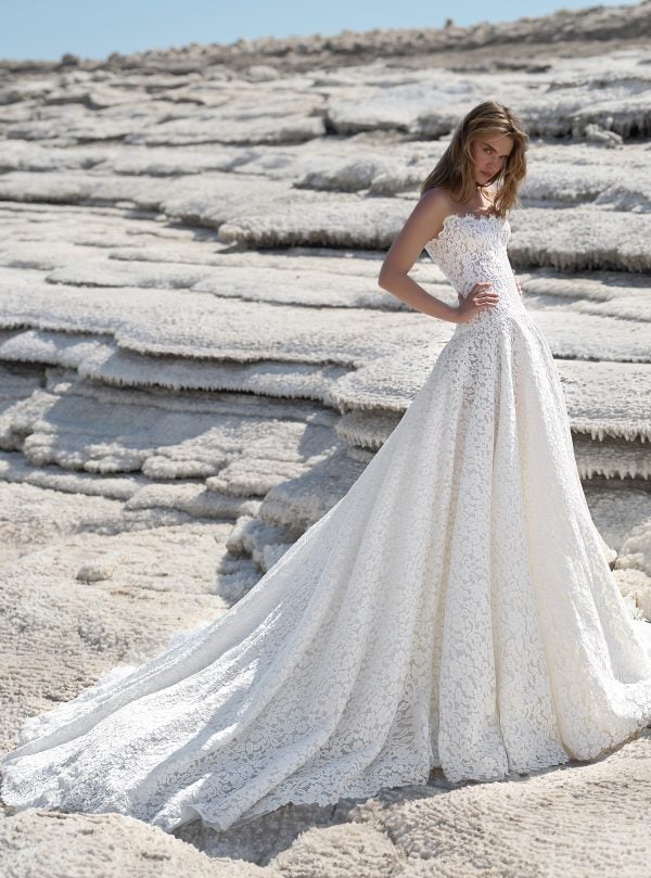This exquisite strapless ball gown features luxurious lace delicately embellished with intricate beading. A structured drop-waist corset bodice defines the figure before flowing into a grand skirt. Delicate lashes create an organically scalloped trim along the scoop neck and backline. Best of all, a long, aisle-worthy train cascades behind.