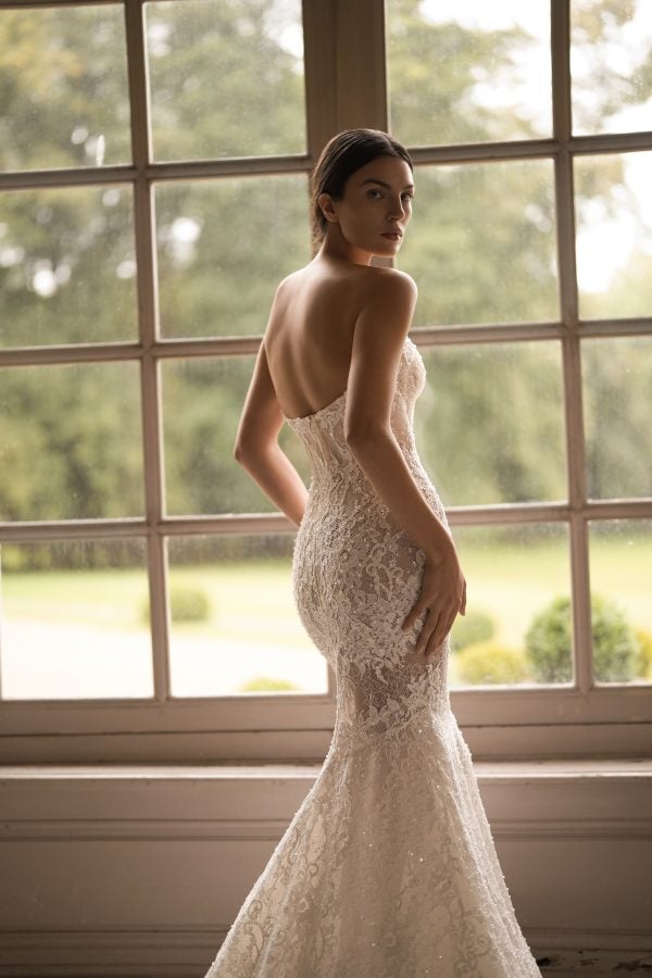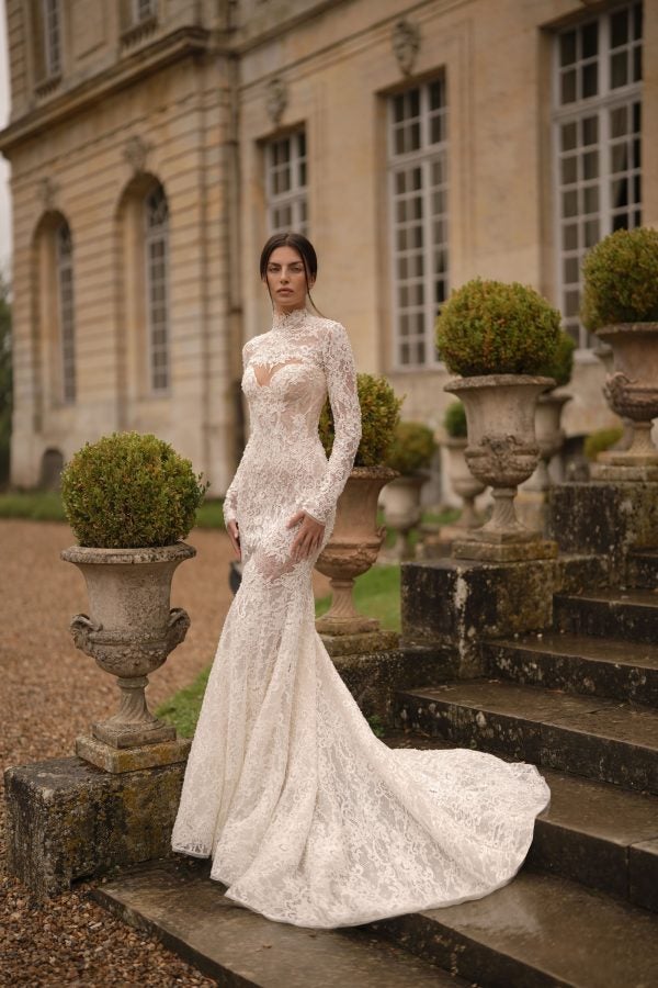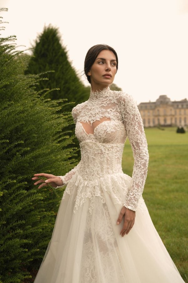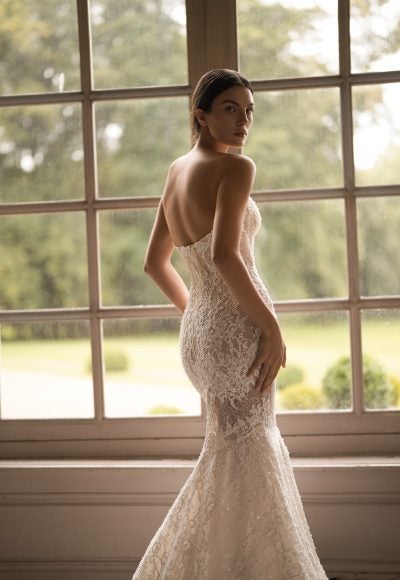 Featuring a strapless cut paired with a sweetheart neckline, this fit-and-flare gown exudes pure romance and femininity. The corset bodice defines the upper body while luxurious lace lavishly decorated with pearls adorns the entirety of the figure-hugging silhouette. Semi-sheer cutouts add a tastefully sexy edge before the intricate fabric melts into an aisle-worthy train. Instantly elevate this chic bridal look with the gown’s matching detachable long sleeve topper and dramatic overskirt.