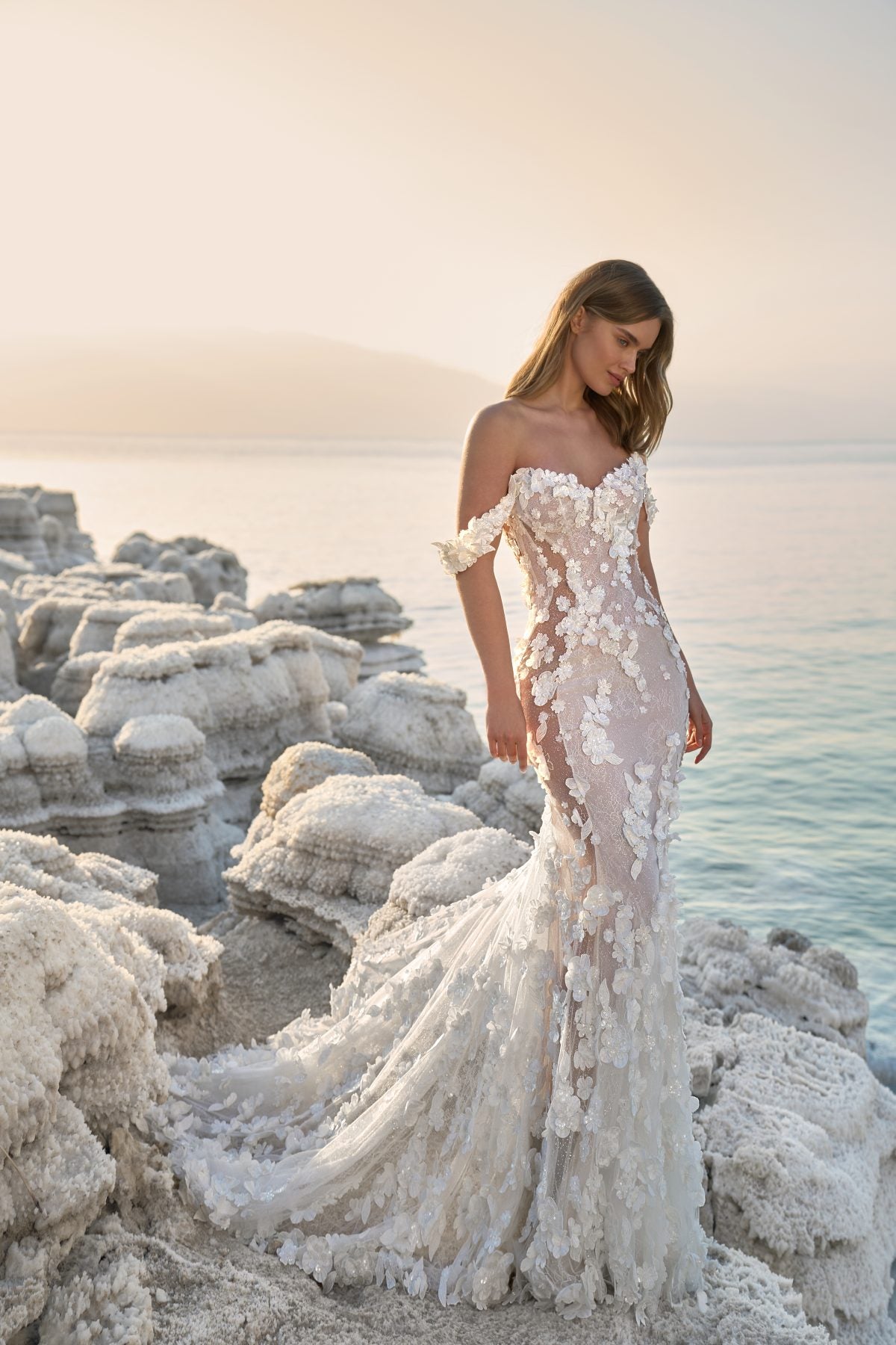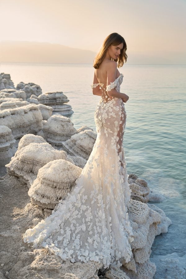 This striking fit-and-flare gown features unforgettably dramatic sheer side panels that effortlessly elongate and accentuate the curve of the body. A flurry of three-dimensional floral and leafy appliqués scatter throughout the figure-hugging silhouette lined with a layer of delicate Chantilly lace. A modern sweetheart neckline melts into romantic off-the-shoulder straps while a low illusion backline cascades into an aisle-worthy train.