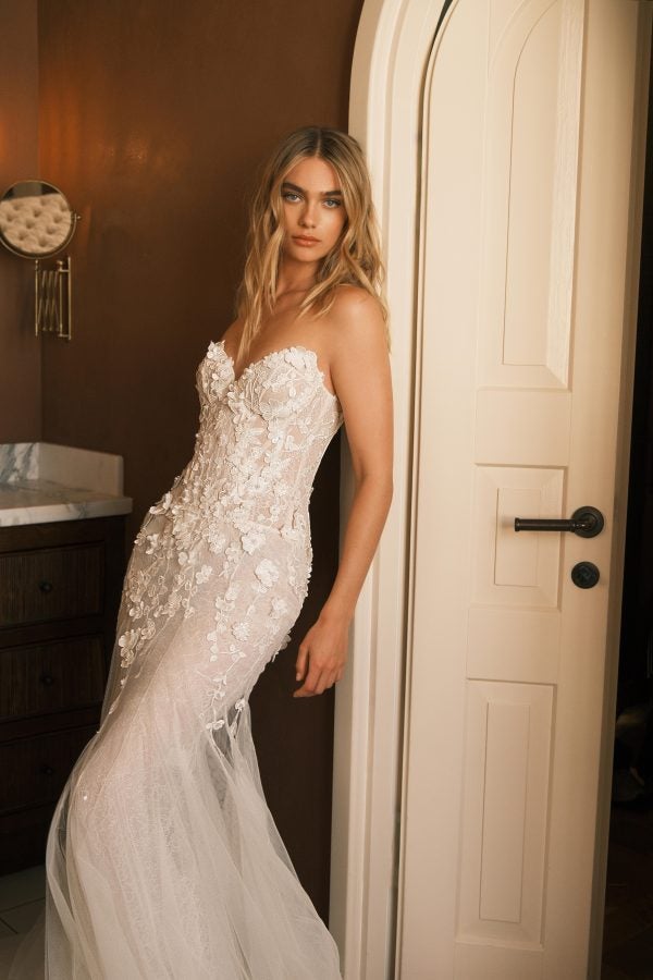 The Daisy gown is a figure-hugging style featuring a strapless sweetheart neckline paired with a modern corset bodice. Intricate floral embellishments effortlessly cascade throughout the delicate lace and tulle fabric. Instantly elevate this romantic bridal look with its detachable off-the-shoulder cape sleeves.