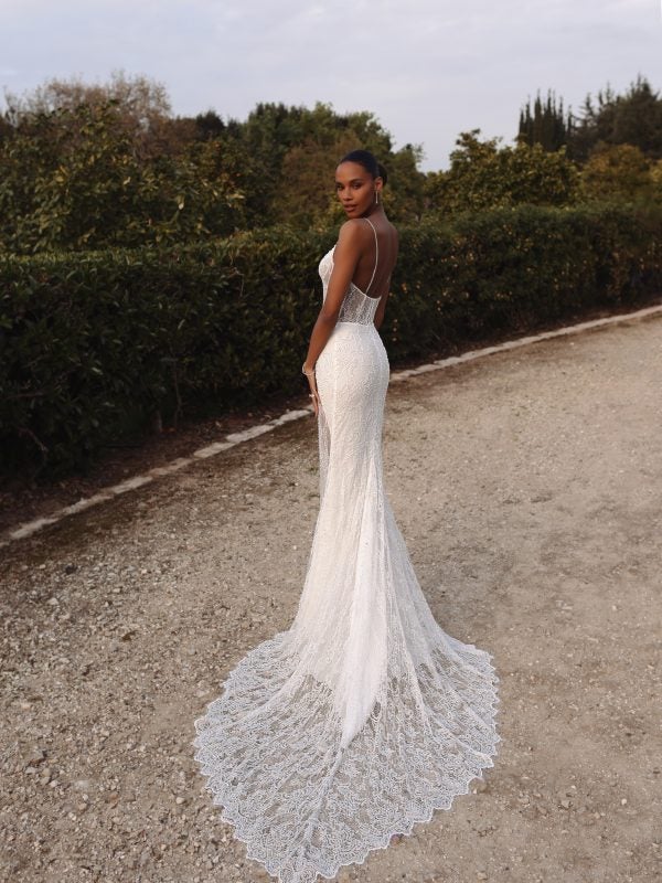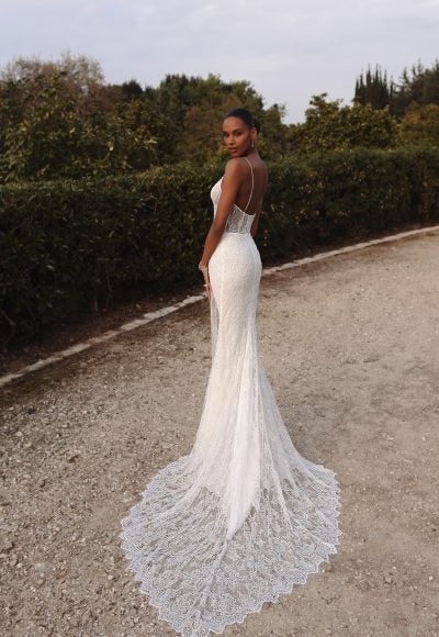 This sleek and sexy sheath gown features dainty spaghetti straps that melt into a scoop neckline. Creating irresistible shimmer from head to toe, the gown is expertly crafted with hand-beaded Chantilly lace and water-crystal appliqués. The sheer corset bodice perfectly sculpts the upper body before falling to a basque waistline. Sheer cutouts intentionally elongate the legs while a train featuring a delicate lash trim completes this romantic bridal look.
