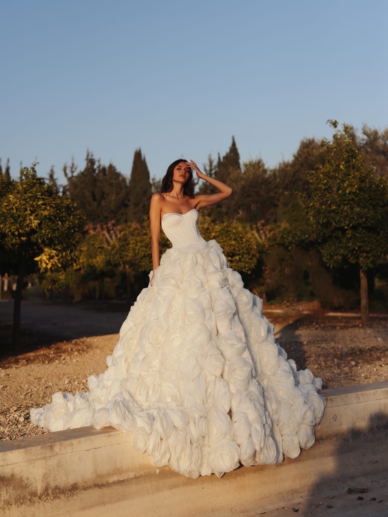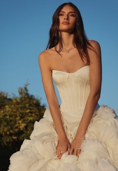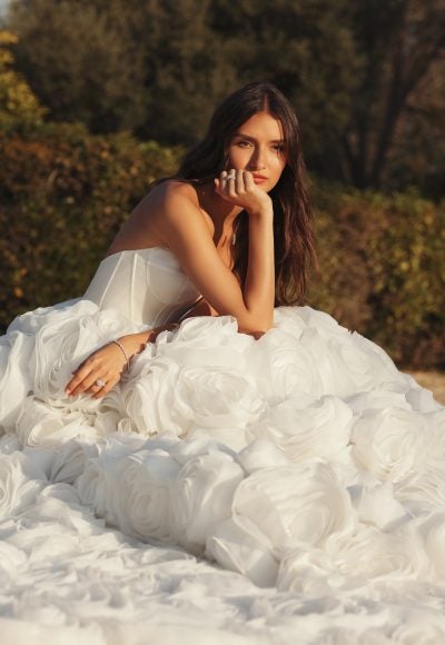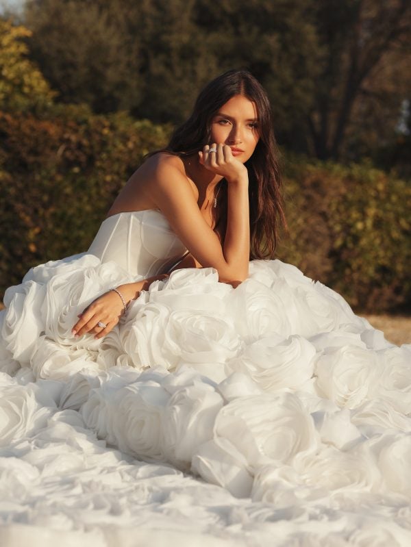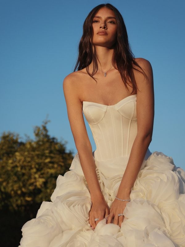 Extravagant and romantic, this ball gown features a strapless cut and contemporary sweetheart neckline that elegantly frames the décolletage. The designer’s signature corset bodice showcases topstitched boning details and perfectly sculpts the upper body before falling to a dropped waistline. A flurry of hand-crafted, three-dimensional organza rosettes adorn the entirety of the gown’s statement-making full skirt.