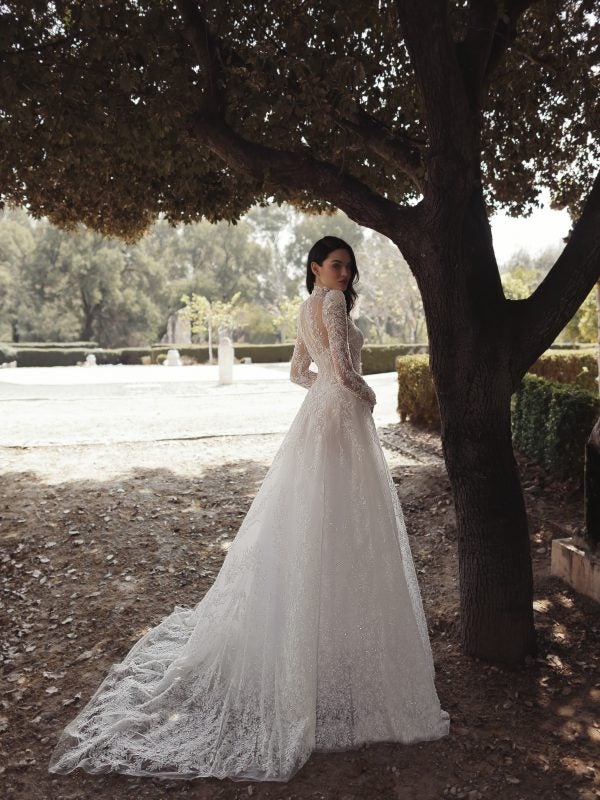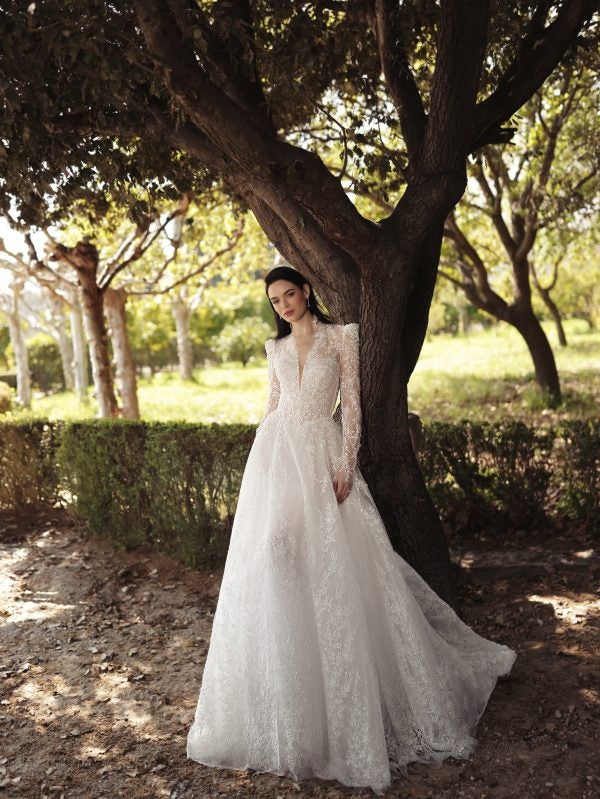 Meticulously crafted with beaded, laser-cut floral embroidery, this breathtaking A-line gown features a high collar V-neckline and puffed, long sleeves. The sheer corset bodice defines the upper body before meeting a subtle basque waistline. The ornate beading shimmers throughout the full skirt and cascades into the designer’s signature pointed train. To finish, the sophisticated, high, illusion backline completes this regal and romantic bridal look.