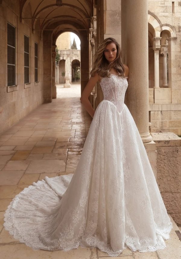 Regal and romantic, this sleek ball gown features a strapless cut and an arched neckline complete with a delicate lash trim. The sheer corset bodice sculpts the upper body and showcases exposed boning before meeting a basque waistline. Expertly crafted with shimmering Alençon lace from head to toe, the full skirt cascades into a breathtaking [...]