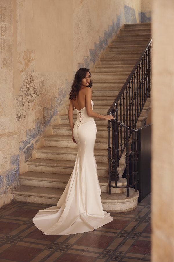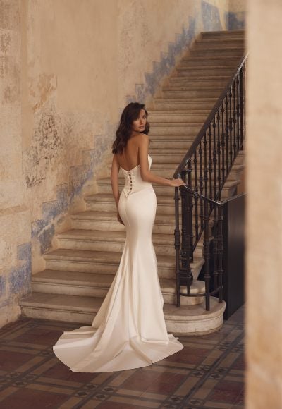This chic and sophisticated fit-and-flare gown is crafted with luxurious stretch satin fabric. The strapless cut is paired with a scooped neckline before melting into a structured corset bodice. The basque waistline and vertical seams adorning the skirt effortlessly elongate the body. Instantly elevate this timeless yet fashion-forward bridal look with its detachable bolero featuring pearl buttons and a wrapped neckline.