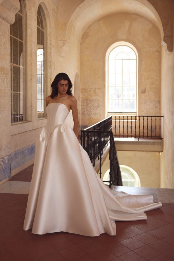 This sleek and simple silk Mikado ball gown is what minimalist’s dreams are made of. The strapless cut is paired with a rounded neckline that frames the décolletage. Intentionally-placed princess seams complete the structured bodice and basque waistline before cascading into a pleated full skirt. To finish, three-dimensional floral appliqués adorn the lace-up back and aisle-worthy train.