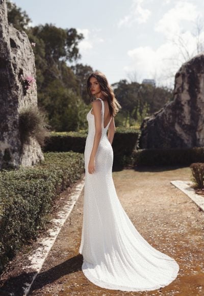 This shimmering sheath gown features thin straps and a softly-scooped, square neckline that melts into a breathtakingly-low, open back. Expertly crafted with meticulous pearl and sequin beading, the cohesive and minimalist design cascades throughout the sleek silhouette. A figure-hugging, nude bodysuit hidden underneath ensures the gown fits like a second skin. To finish, a stunning circle-cut train completes this effortlessly glamorous bridal look.