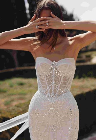 This glamorous, Art Deco-inspired gown is intricately embellished with tonal beading and the designer's signature Swarovski crystals. Featuring a strapless cut, the pointed, sweetheart neckline elegantly frames the décolletage while a sheer, corset bodice sculpts the upper body. The basque waistline cascades into a sleek, figure-hugging skirt and into the lightweight train. Complemented by a [...]