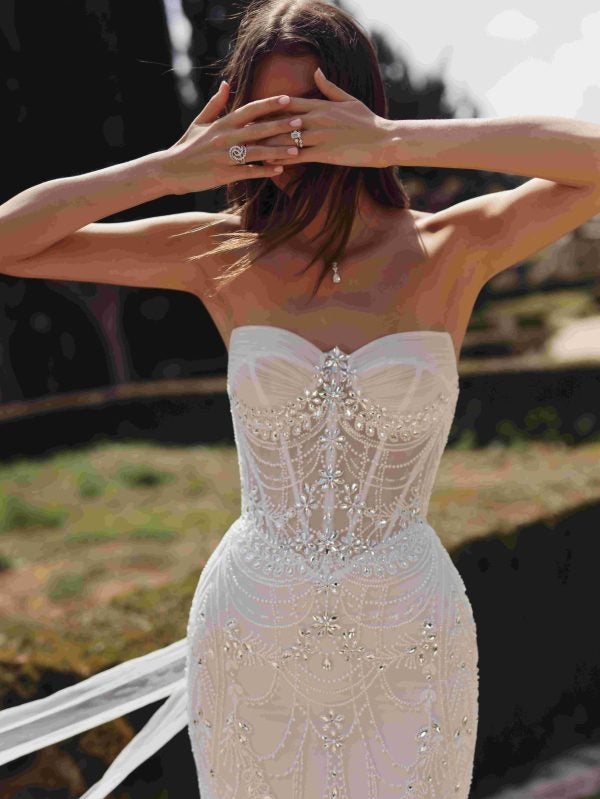 This glamorous, Art Deco-inspired gown is intricately embellished with tonal beading and the designer’s signature Swarovski crystals. Featuring a strapless cut, the pointed, sweetheart neckline elegantly frames the décolletage while a sheer, corset bodice sculpts the upper body. The basque waistline cascades into a sleek, figure-hugging skirt and into the lightweight train. Complemented by a silk tulle ribbon, the lace-up back ensures an impeccable fit and completes this couture bridal look.