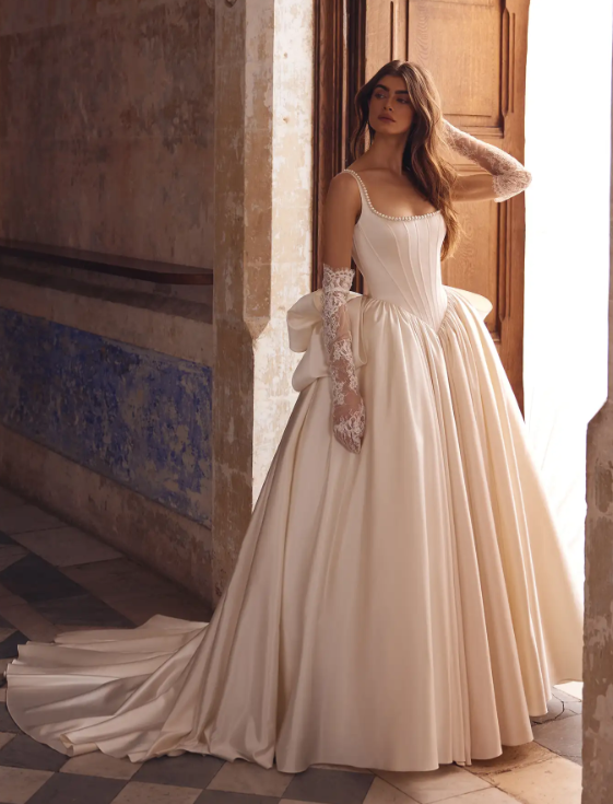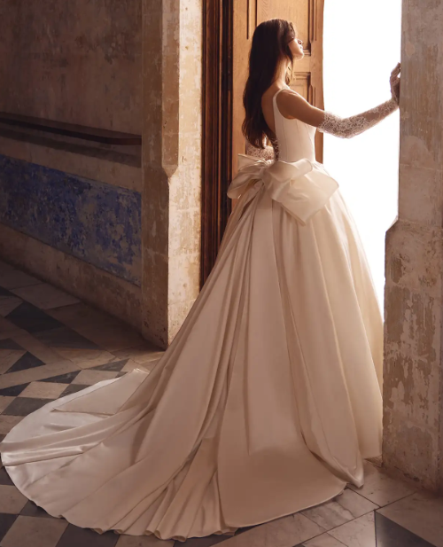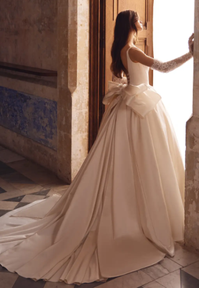 This impeccably-crafted satin ball gown is the epitome of timeless elegance. The pearl-embellished square neckline effortlessly frames the décolletage while the designer’s signature bow completes the low back. A figure-defining corset bodice features a basque waistline before erupting into a pleated, full skirt.