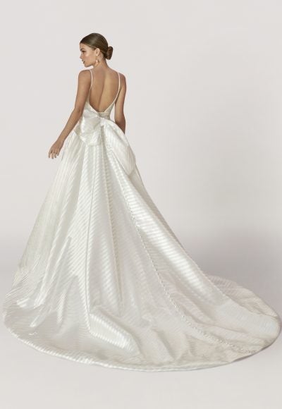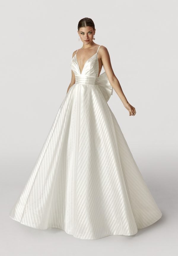 This classic yet strikingly unique striped ball gown features dainty spaghetti straps that cascade into a plunging V-neckline and a daringly open back complete with an abstract bow and an infinite row of fabric-covered buttons. The delicately-pleated bodice meets a waist-defining cummerbund before erupting into a statement-making, full skirt.