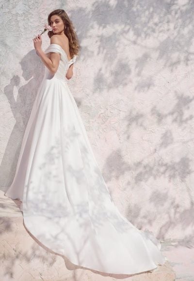 Falling on the ultra-luxe-fairytale end of the spectrum—a satin off-the-shoulder bridal gown designed for exceptional wedding portraits.