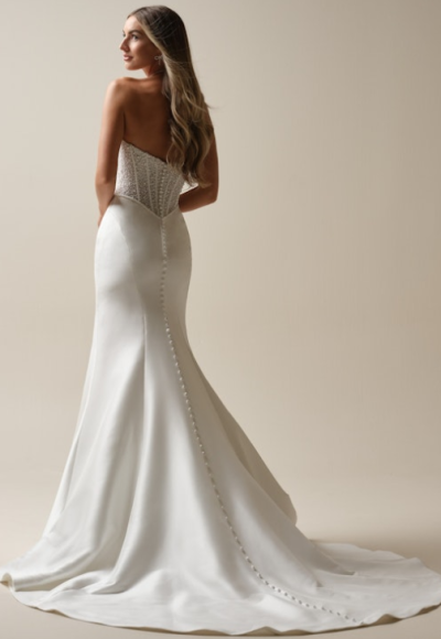 Exuding modern elegance, this fit-and-flare gown features a strapless cut and plunging sweetheart neckline that showcases the décolletage. Designed with a layer of shimmer tulle, the sheer corset bodice is densely adorned with pearls and beading. The basque waistline meets a figure-hugging skirt expertly crafted with Sincere Stretch Mikado fabric. To finish, a row of fabric-covered buttons and a detachable overskirt complete this chic bridal look.