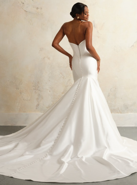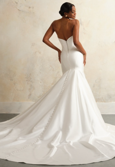 Chic and sophisticated, this fit-and-flare gown is expertly crafted with Cartago Satin that sculpts the body from head to toe. The strapless cut and asymmetrically-draped sweetheart neckline elegantly frame the décolletage before meeting a structured corset bodice with boning. More draping adorns the figure-hugging skirt while a row of fabric-covered buttons and long train complete this timeless bridal look. Instantly elevate this ensemble with this gown’s detachable off-the-shoulder Watteau train.