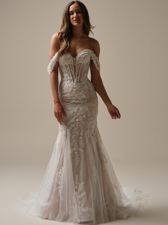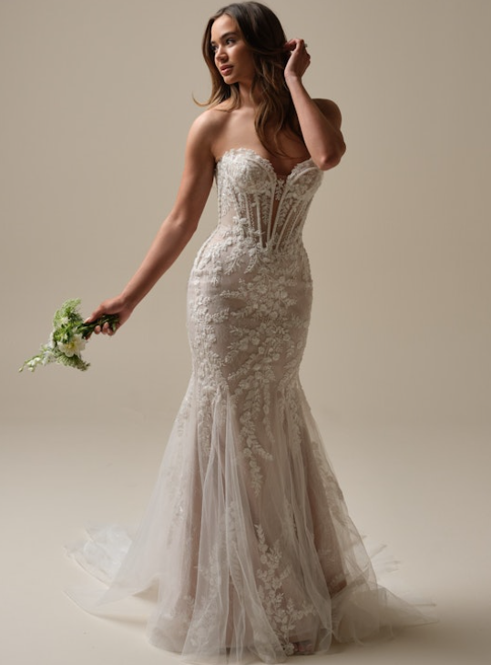 This romantic fit-and-flare gown features a strapless cut and plunging sweetheart neckline that elegantly frames the décolletage. The sheer corset bodice sculpts the upper body before meeting a subtle basque waistline. Expertly designed with scattered beading and embellished floral appliqués, the organic design cascades throughout the figure-hugging silhouette. To finish, fabric-covered buttons, detachable off-the-shoulder, puff sleeves, and a breathtaking lightweight train completes this modern bridal look.