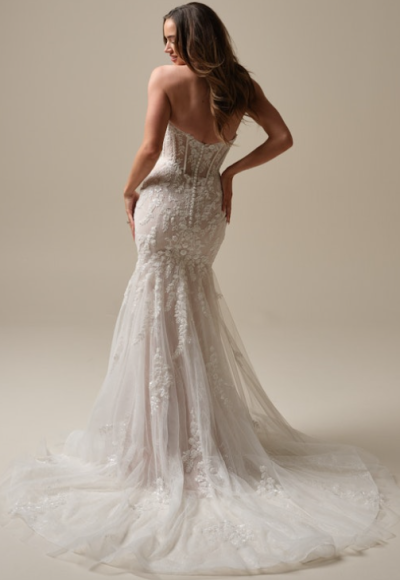 This romantic fit-and-flare gown features a strapless cut and plunging sweetheart neckline that elegantly frames the décolletage. The sheer corset bodice sculpts the upper body before meeting a subtle basque waistline. Expertly designed with scattered beading and embellished floral appliqués, the organic design cascades throughout the figure-hugging silhouette. To finish, fabric-covered buttons, detachable off-the-shoulder, puff [...]