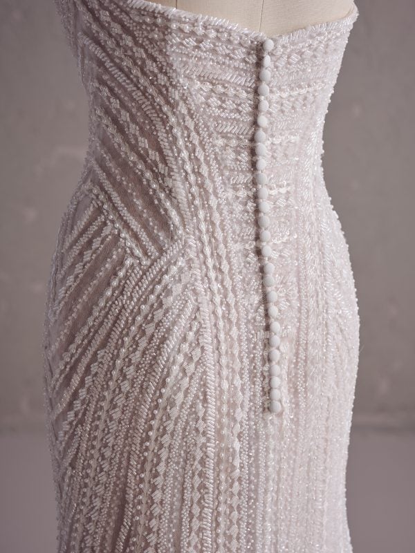 Intentionally designed to sculpt and accentuate the curve of the body, this shimmering fit-and-flare gown is nothing short of spectacular. Ideal for the bride seeking a sleek and modern statement, the figure-hugging style is crafted with delicate tulle and intricately beaded embellishment. Its strapless cut is met by a contemporary sweetheart neckline before melting into an elongating illusion plunge. Best of all, fabric-covered bridal buttons complete the back.