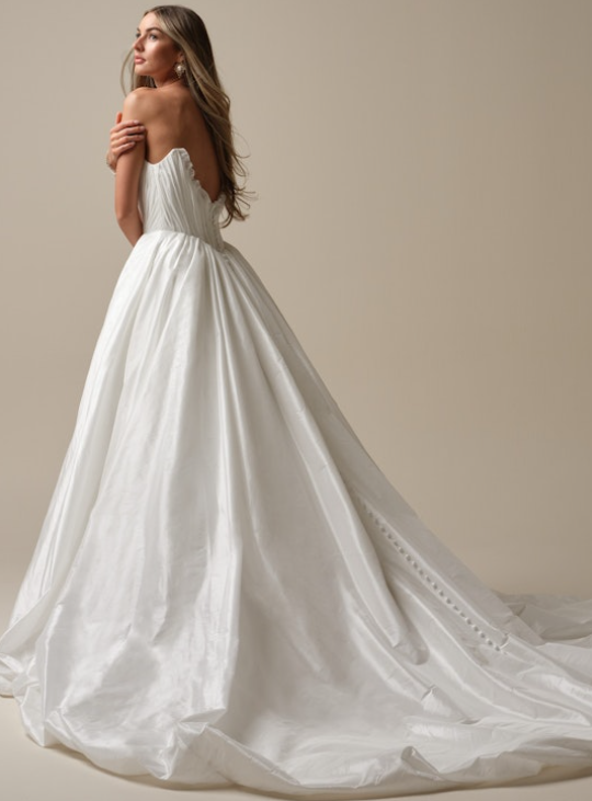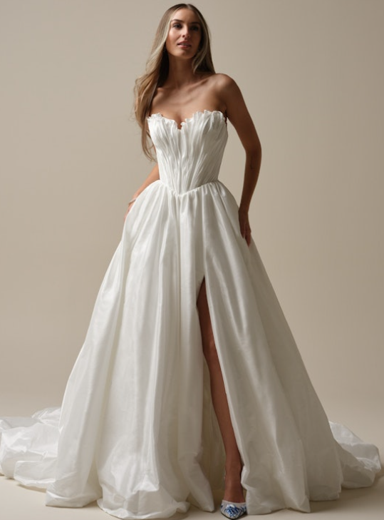 Style #LAFAYETTE-A01Strapless Silk Taffeta Ball Gown With Slit And Buttons